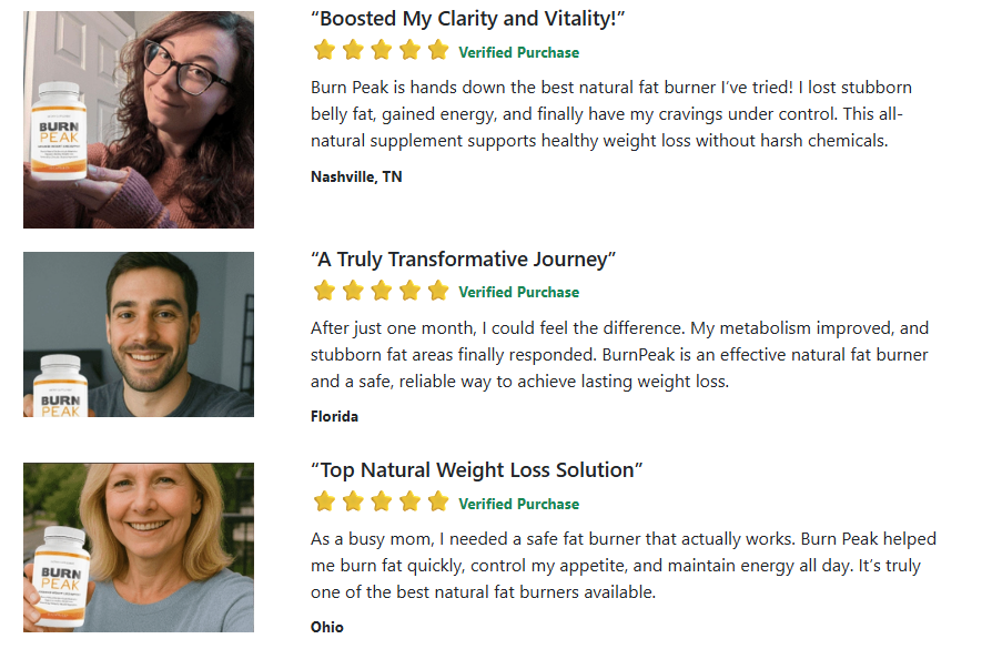 Many satisfied users share experiences of feeling more energetic, motivated, and balanced throughout their weight management journey. Customer feedback on the Burn Peak Official Website often highlights: